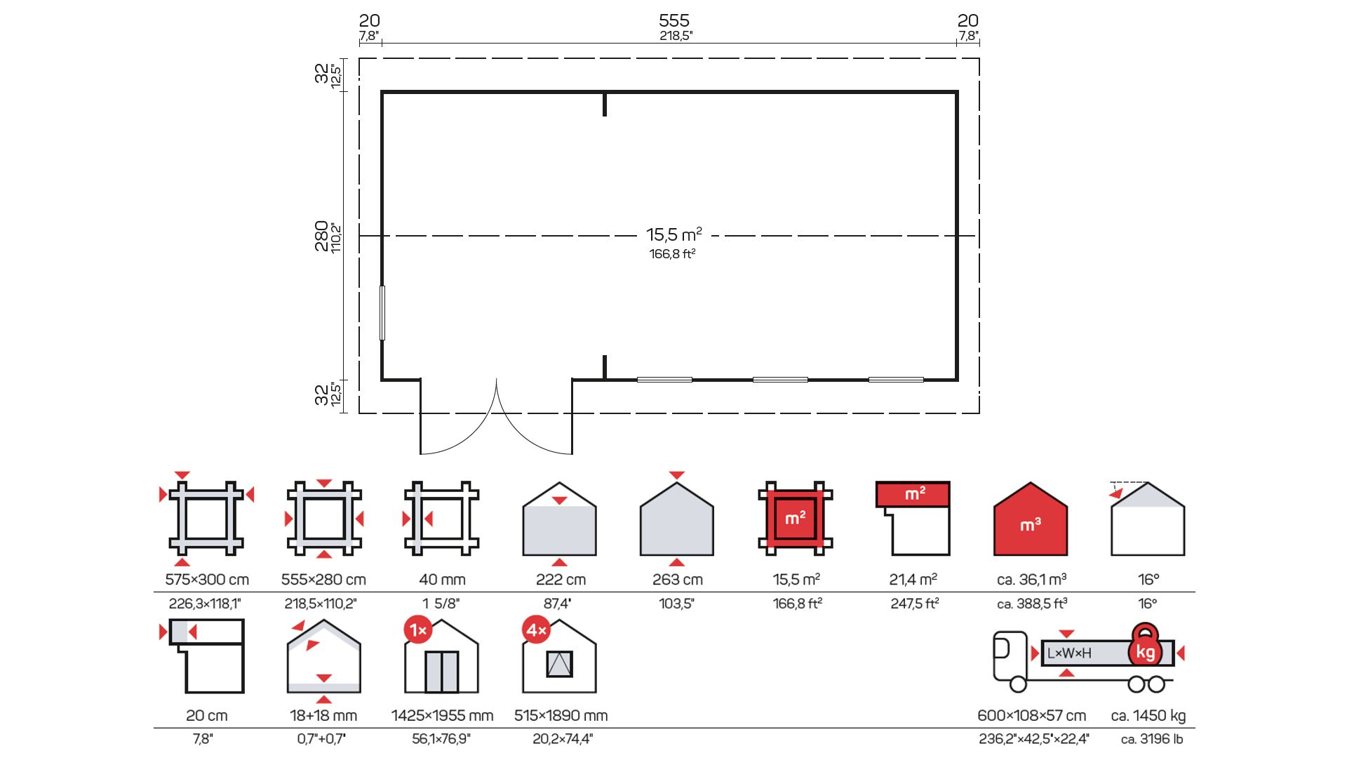 Fal méretei (szélesség x hossz): 555 x 280 cm