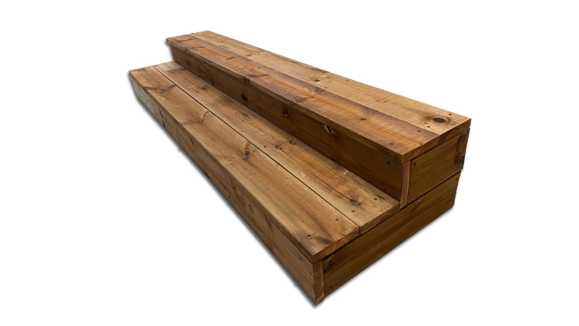 A lépcsők masszív, barna színű, strapabíró fa deszkákból készülnek, 145 x 28 mm méretűek. A táblák között kis rések vannak, amelyeken keresztül a víz el tud folyni. A széles deszka masszív és elegáns megjelenést kölcsönöz a lépcsőknek. A tábla barna csavarokkal van rögzítve. Az állandó fa jól bírja az időjárási viszonyokat, ezért nem kell karbantartani. Fenntartó intézkedésként elegendő 1-2 évente favédőszerrel vagy olajjal végzett kezelés, az első évben nincs szükség kezelésre. A karbantartó kezeléshez kapcsolódóan lehetőség van a lépcsők színezésére is színes favédő szerrel.