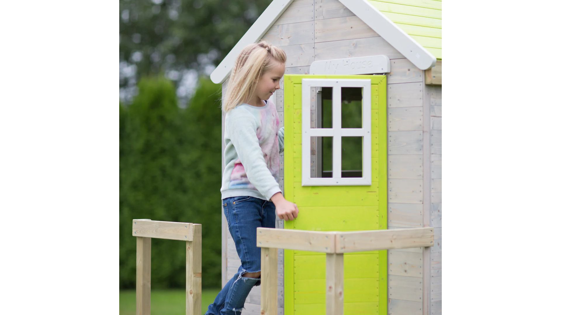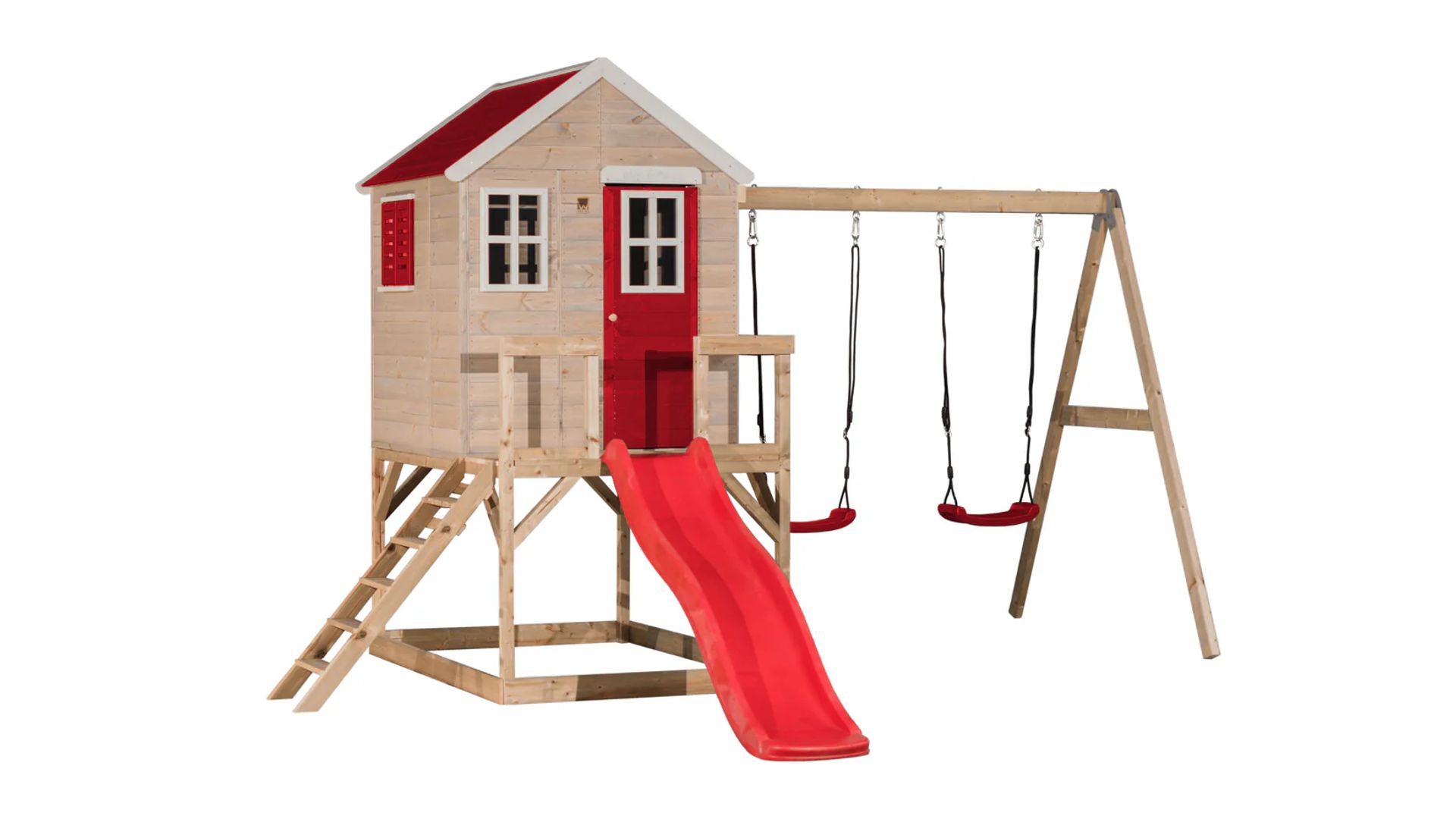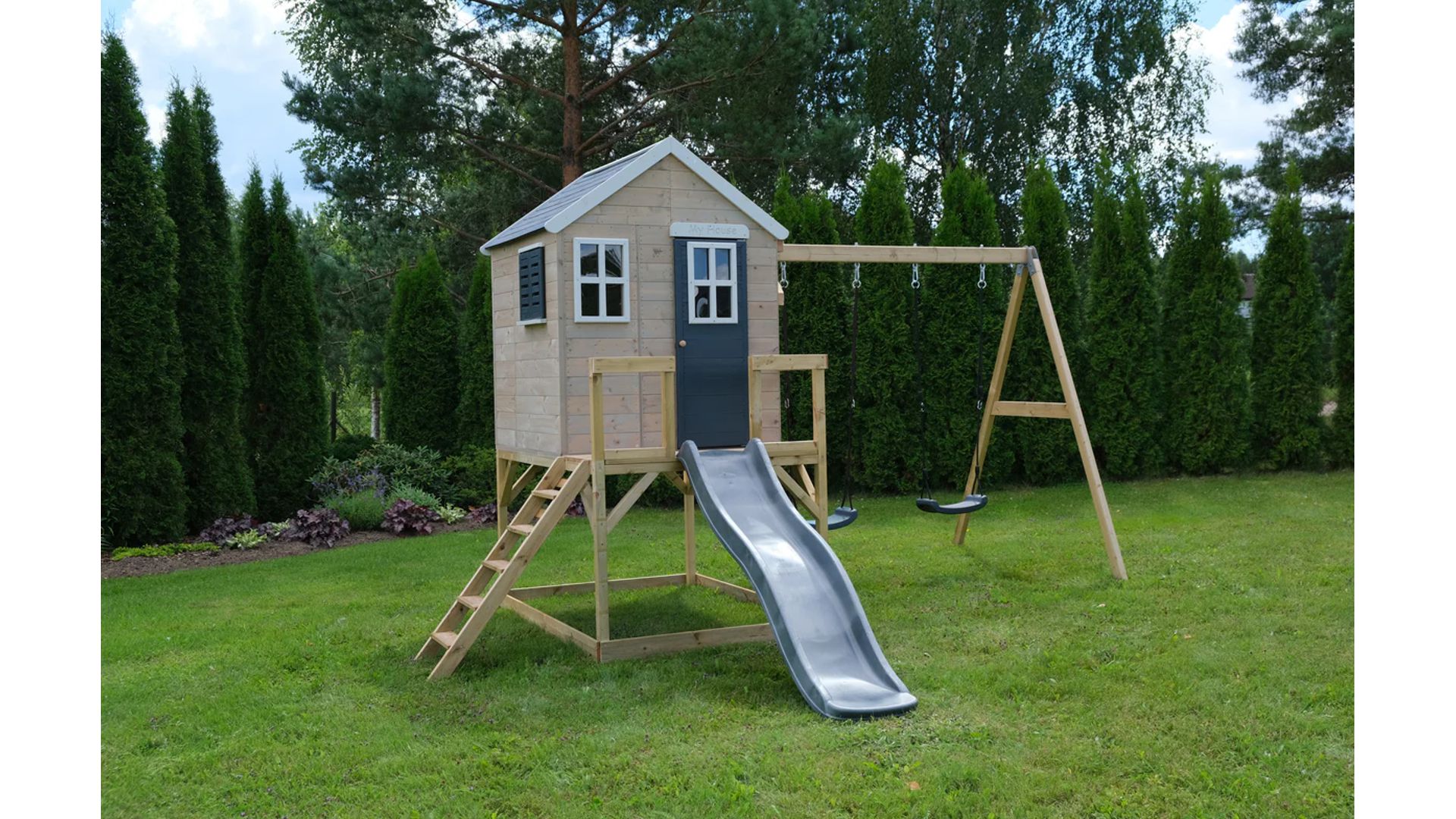 Ezt a 90 cm magas platformra épített játszóházat úgy tervezték, hogy gyermeke aktívan és elkötelezetten maradjon. A játszóház elején egy 175 cm hosszú műanyag csúszda kínál órákig izgalmas szórakozást. Amíg az egyik a nyaralóban szórakozik, a másik ezeregy történetet képzel el a nyaraló tornácán. Az emelvény alatti hely minden gyermekjáték tárolására használható.