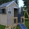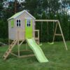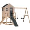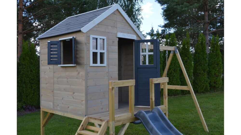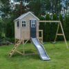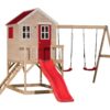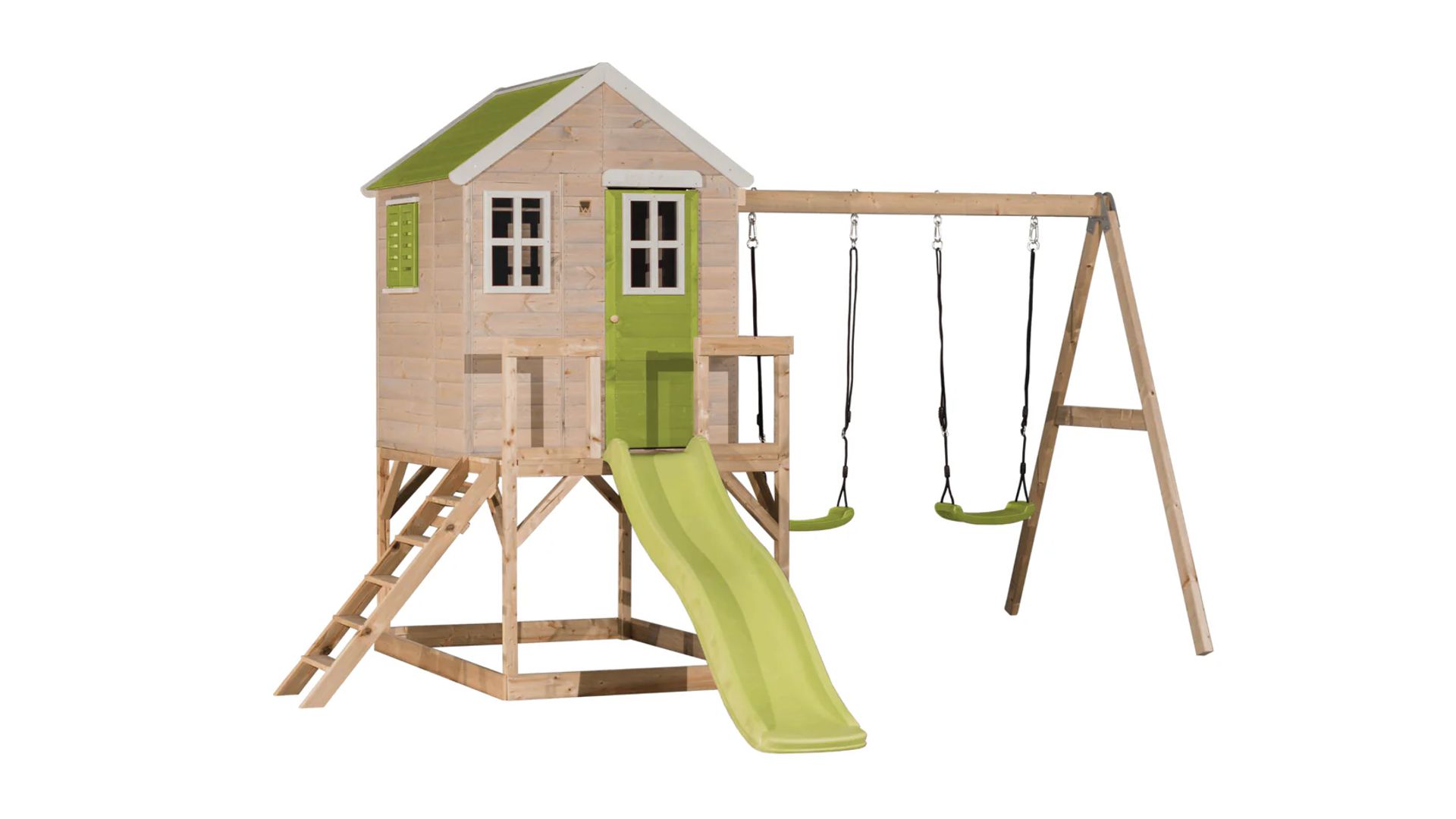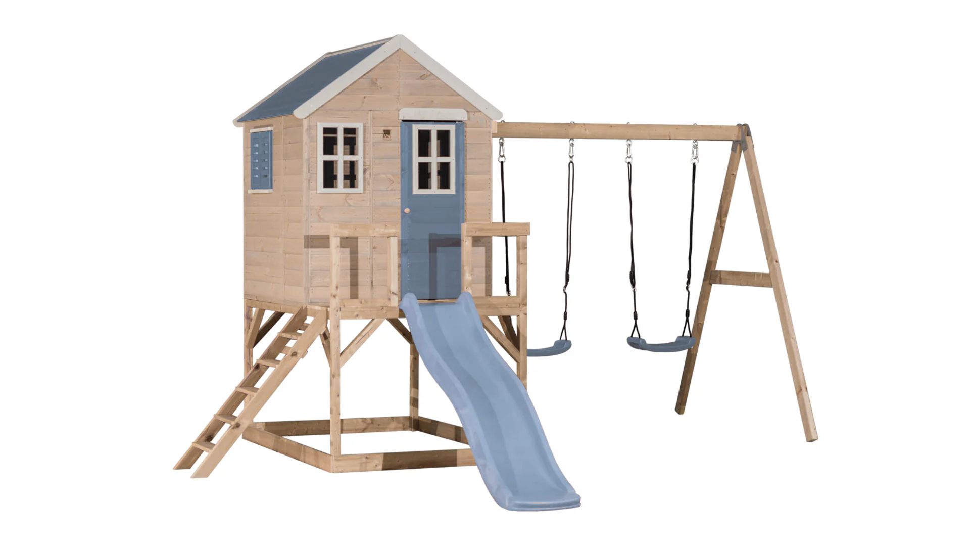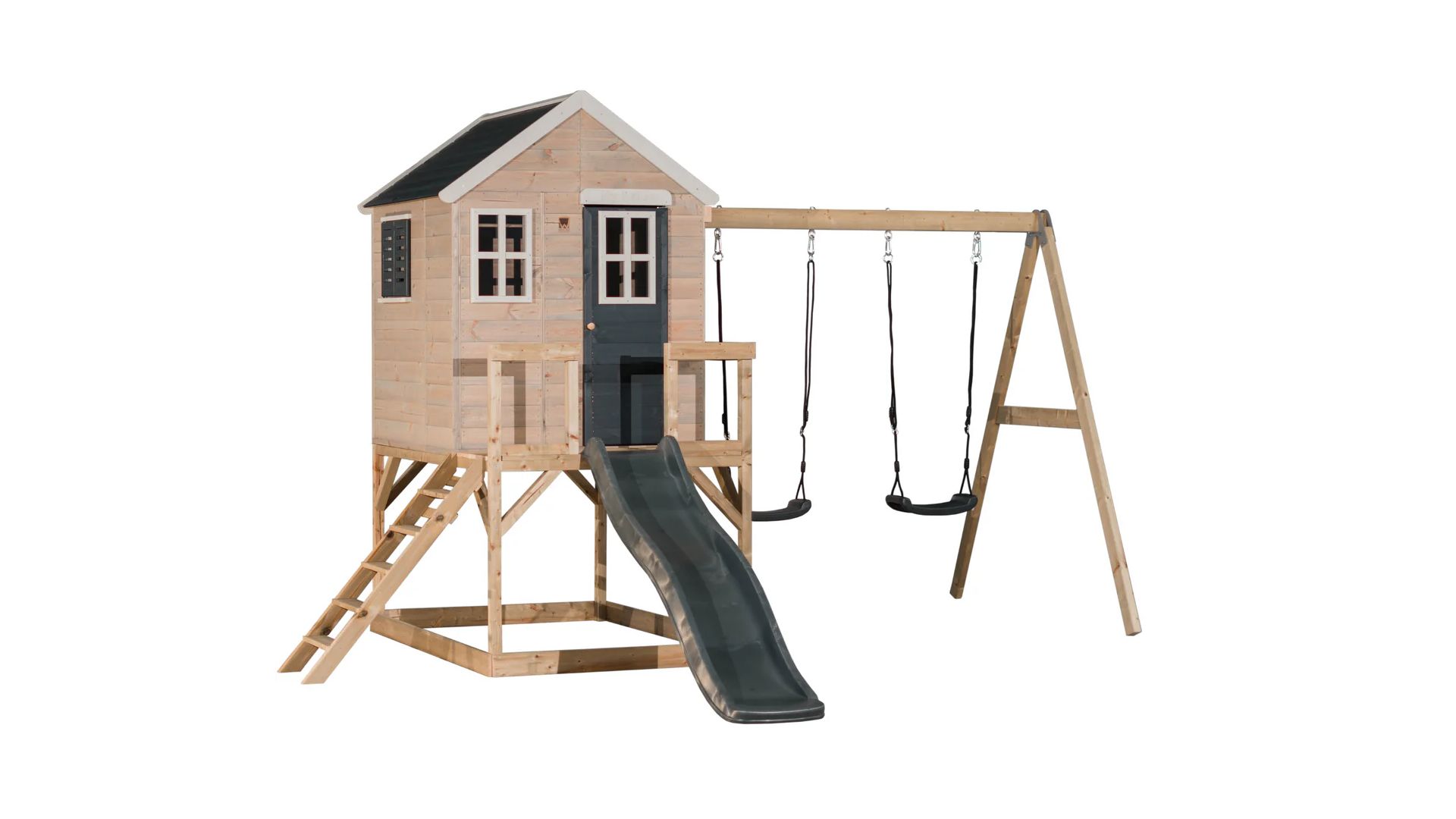 Ezt a 90 cm magas platformra épített játszóházat úgy tervezték, hogy gyermeke aktívan és elkötelezetten maradjon. A játszóház elején egy 175 cm hosszú műanyag csúszda kínál órákig izgalmas szórakozást. Amíg az egyik a nyaralóban szórakozik, a másik ezeregy történetet képzel el a nyaraló tornácán. Az emelvény alatti hely minden gyermekjáték tárolására használható.