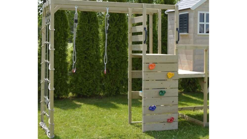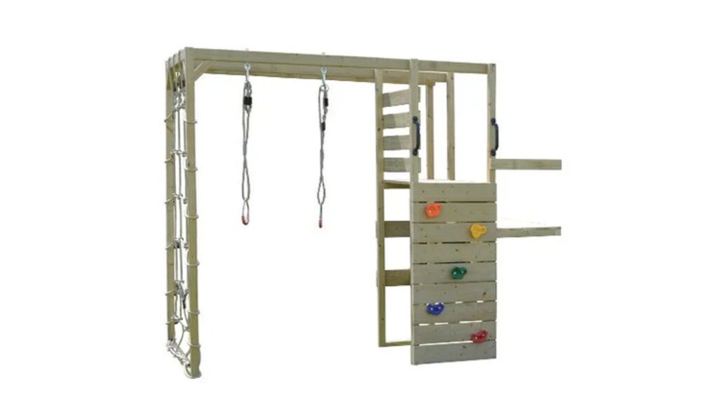 Készüljön fel arra, hogy nézze, ahogy a gyerekek felfedezik, gyakorolják és szórakoznak a friss levegőn egy edzőtermi kiegészítővel. Ha három gyereknek elegendő hely van a játékhoz, remek szórakozásban lesz részük, hogy próbára tegyék határaikat, és megmérettessenek magukkal a mászófallal, mászóhálóval, tornagyűrűkkel és mászórudakkal.