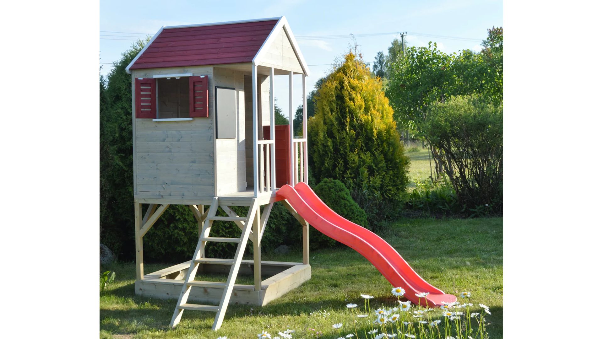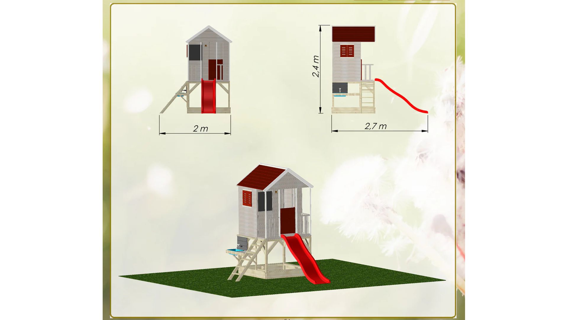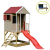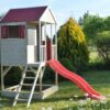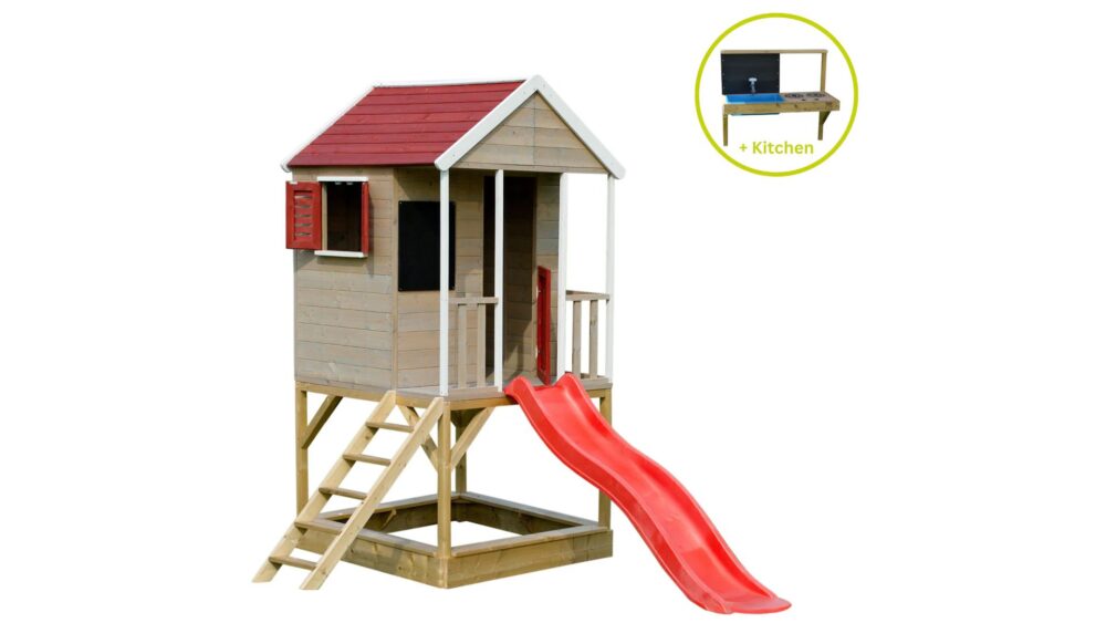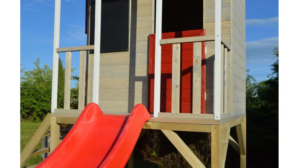 Ezt a 90 cm magas platformra épített játszóházat úgy tervezték, hogy gyermeke aktívan és elkötelezetten maradjon. A platform alatt található egy homokozó, amely tökéletes a kicsik számára, hogy homokvárakat építsenek és felfedezzék kreativitásukat. A játszóház előtt egy 175 cm hosszú műanyag csúszda található, amely biztosan órákig tart majd izgalmas szórakozást.