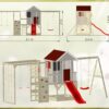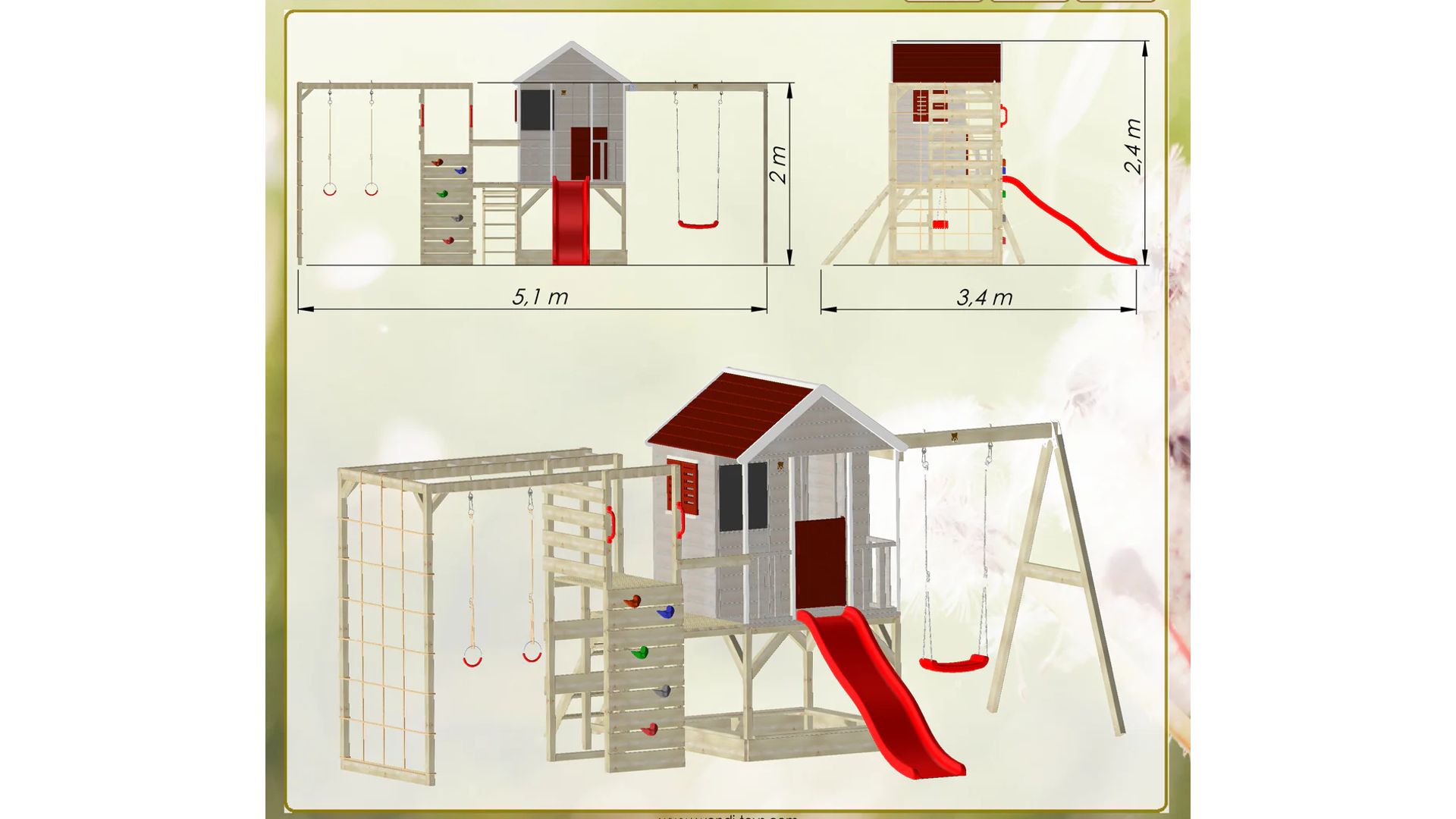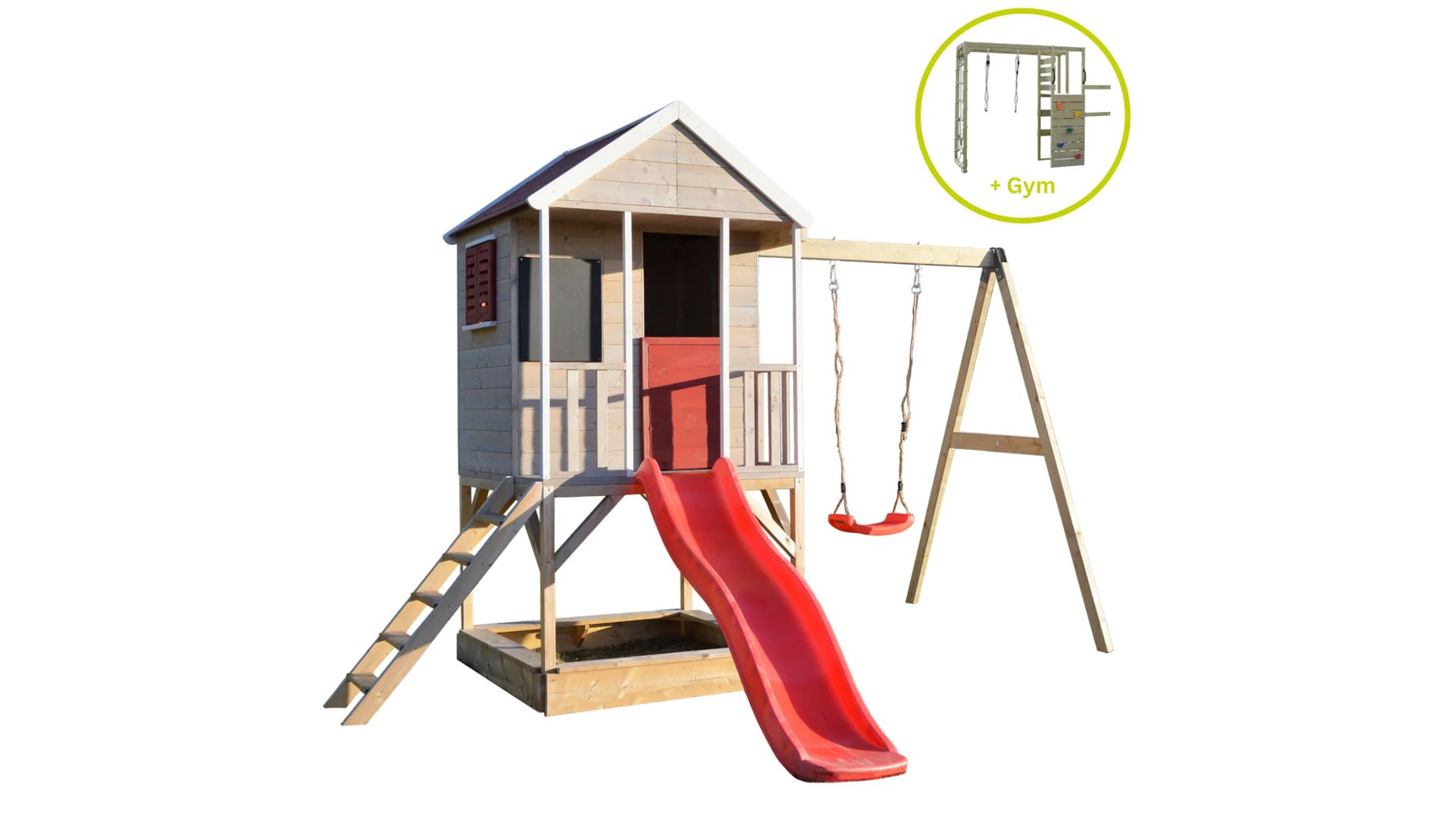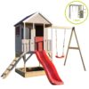 Ez a 90 cm magas platformra épült játszóház órákon át aktívan és elfoglalva tartja kicsinyeit. Az alatta homokozóval, rajzdeszkával, funkcionális redőnnyel ellátott ablakkal, terasszal és polccal a kalandház tele van olyan funkciókkal, amelyek még izgalmasabbá teszik gyermeke játékát! És ha ez még nem lenne elég, van még egy 175 cm hosszú műanyag csúszda és 200 cm magas hinták az oldalakon. Igazi adrenalin!