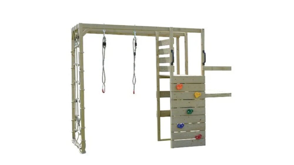 Készüljön fel arra, hogy nézze, ahogy a gyerekek felfedezik, gyakorolják és szórakoznak a friss levegőn egy edzőtermi kiegészítővel. Ha három gyereknek elegendő hely van a játékhoz, remek szórakozásban lesz részük, hogy próbára tegyék határaikat, és megmérettessenek magukkal a mászófallal, mászóhálóval, tornagyűrűkkel és mászórudakkal.