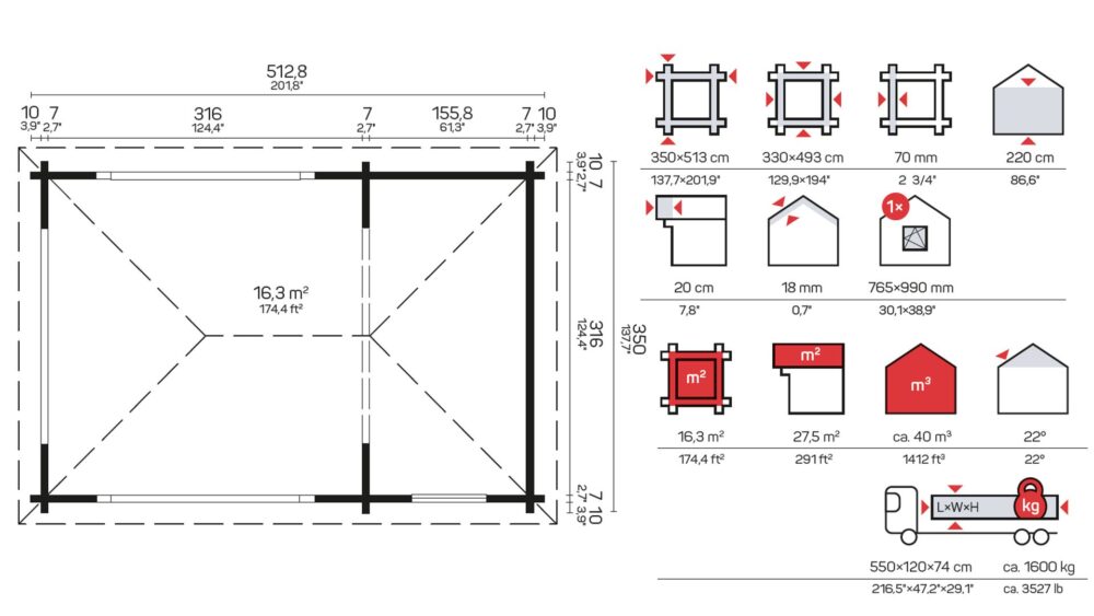 Minden 70 mm-es faház, játszóház, kocsibeálló, nyaraló és garázs szabványos készletet tartalmaz: ajtók, ablakok és rögzítések, amelyek egyszerűvé és gyorssá teszik a házak összeszerelését.