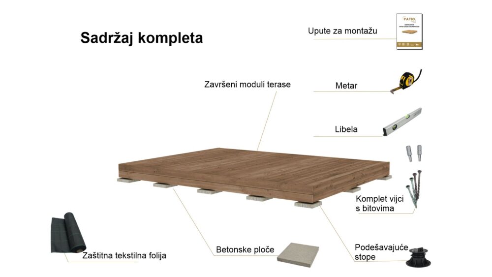 A terasz állítható lábak segítségével betonlapokra kerül elhelyezésre. Az állítható lábak kis egyenetlenségeket tesznek lehetővé a telepítés helyén és kis eltéréseket a talaj lejtésében. Az alacsony állítható láb 40 mm-ig, a magas állítóláb 80 mm-ig teszi lehetővé a magasság változtatását. A terasz magassága a lábak beállításától függően alacsony lábbal 266-306mm, magas lábbal 306-386mm. A szállításhoz tartozik a terasz alá szerelhető szűrőszövet, amely megakadályozza a gyomok növekedését. A beszerelés úgy történik, hogy az elemeket egyenként a helyükre emeljük, a magasságot és a dőlésszöget jobbra állítjuk és a következő elemet a helyére helyezzük. Az elemek csavarkötéssel kapcsolódnak egymáshoz. A csatlakozási mód erős, és a terasz nem dől meg nagy terhelés hatására. Az összes csavart és a szükséges csavarhúzó biteket a szállítás tartalmazza.