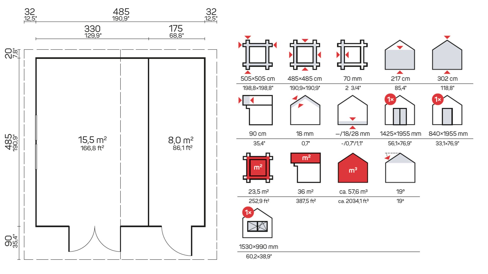 Minden 70 mm-es faház, játszóház, kocsibeálló, nyaraló és garázs szabványos készletet tartalmaz: ajtók, ablakok és rögzítések, amelyek egyszerűvé és gyorssá teszik a házak összeszerelését.