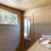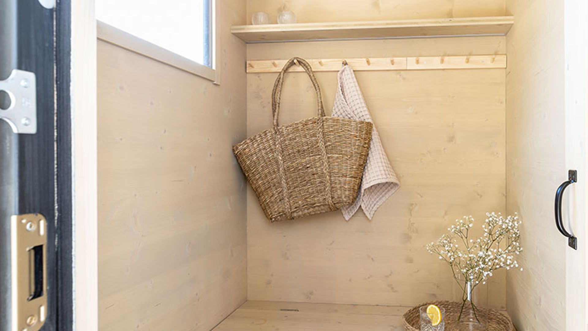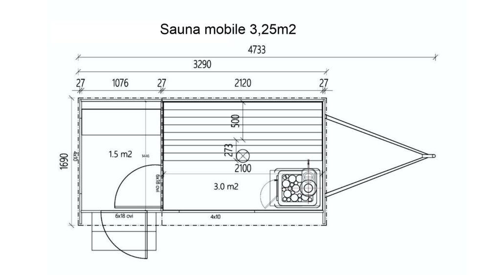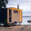 a tóra nézve. Kompakt mérete ellenére a 3,25 m2-es szaunamobil rendelkezik