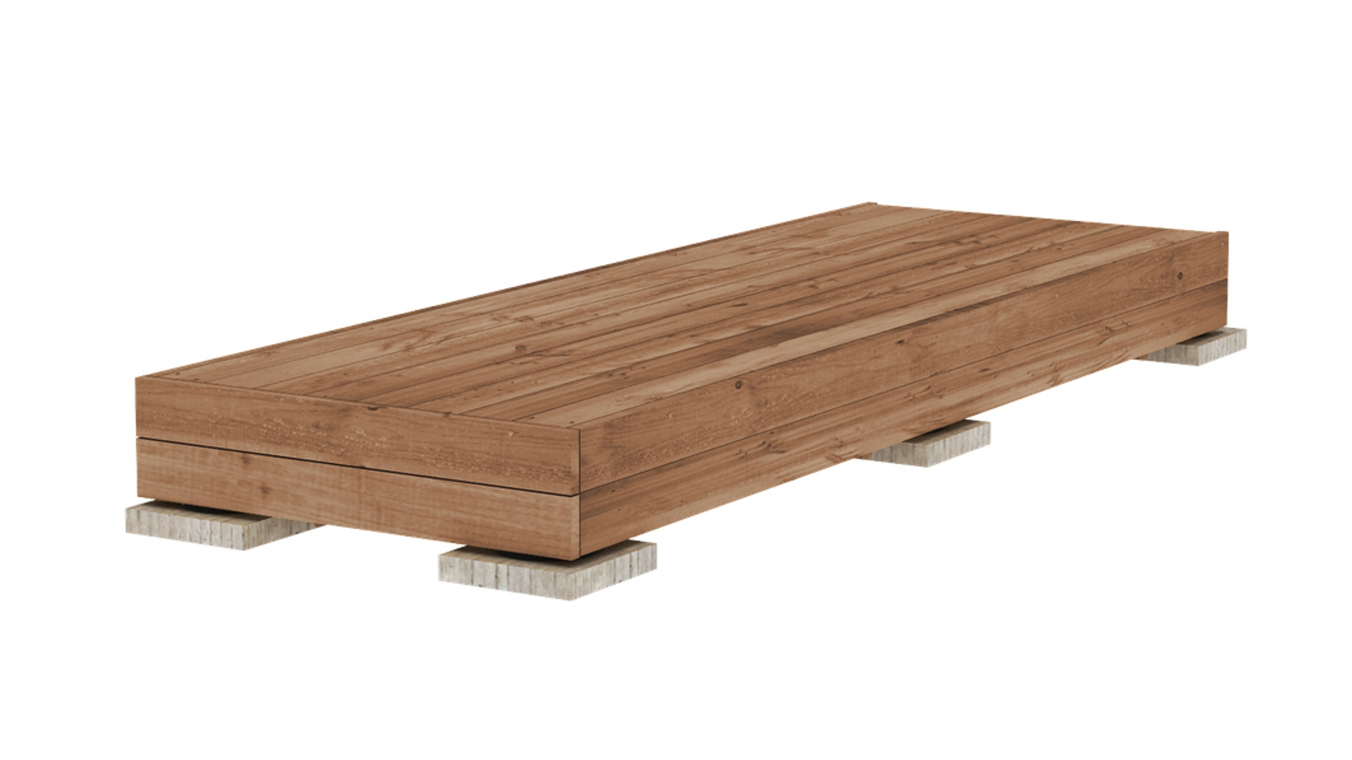 A teraszt 1000 mm x 2000 mm méretű elemként szállítjuk. Az elem súlya akkora, hogy két személy hordozhatja és mozgathatja.